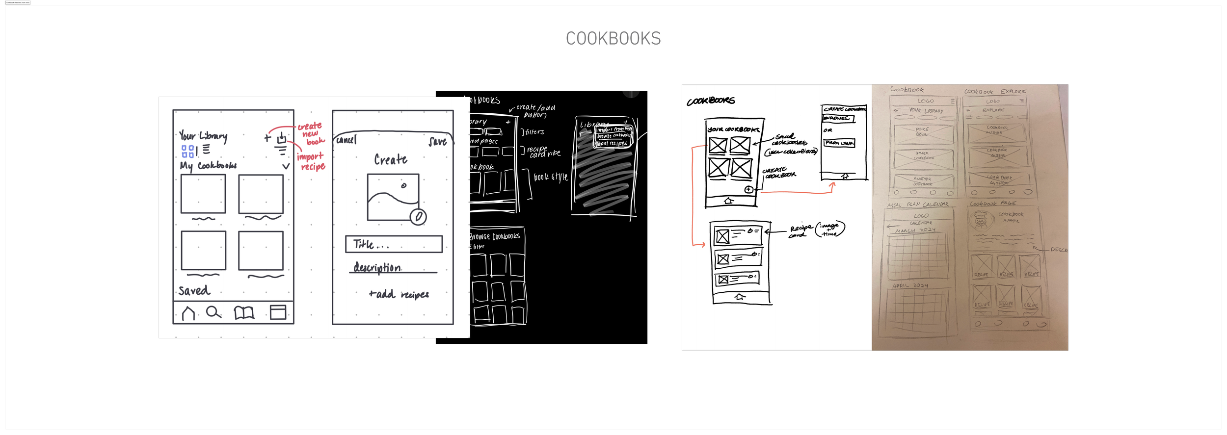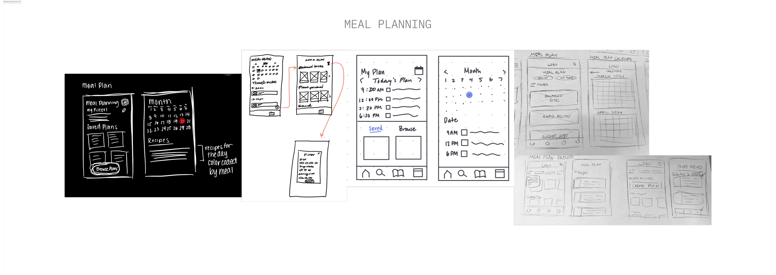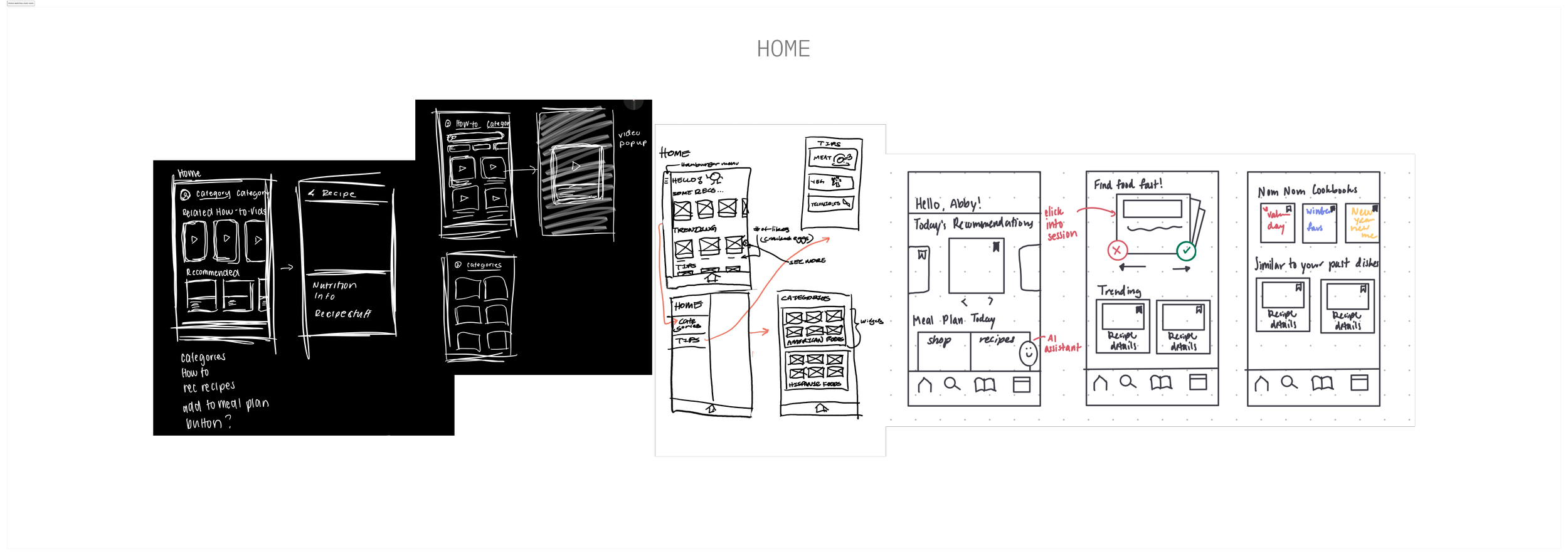 Each team member created sketches of ideas of how to implement our flows and features visually for each main part of the app’s navigation. After consolidating all of our sketches, we discussed how to combine our approaches to best address our insights and personas while maintaining a visually appealing and easily navigable platform.