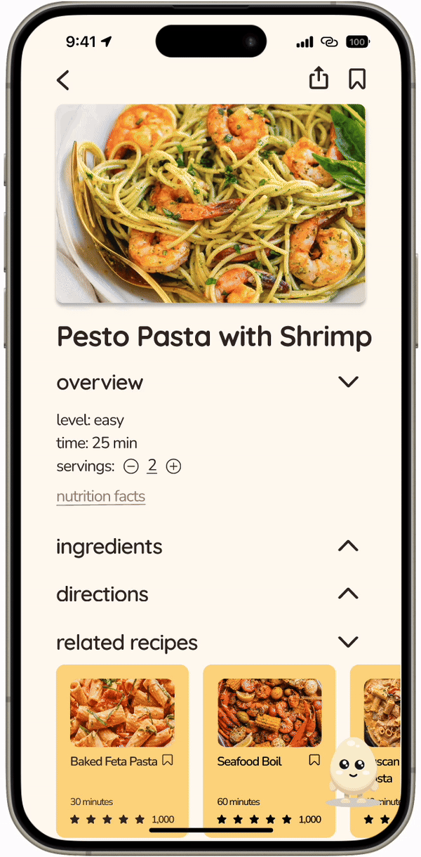 See preparation time and ratings for each recipe directly on the card. Quick save recipes for later without having to click into them first.