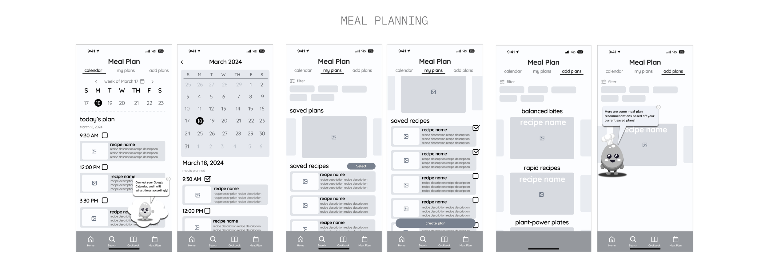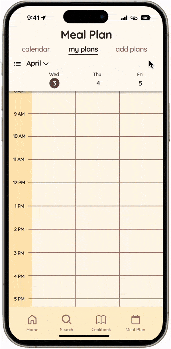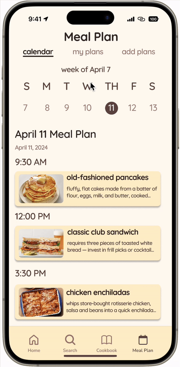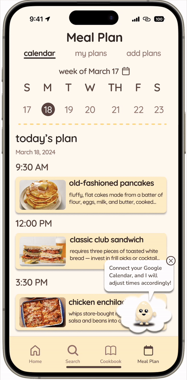 The user can connect their meal plan to their Google Calendar to seamlessly integrate cooking into their daily schedule.