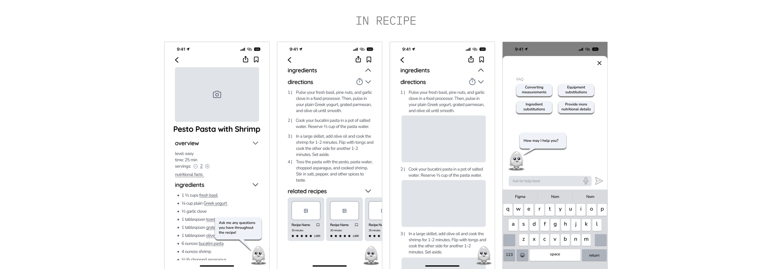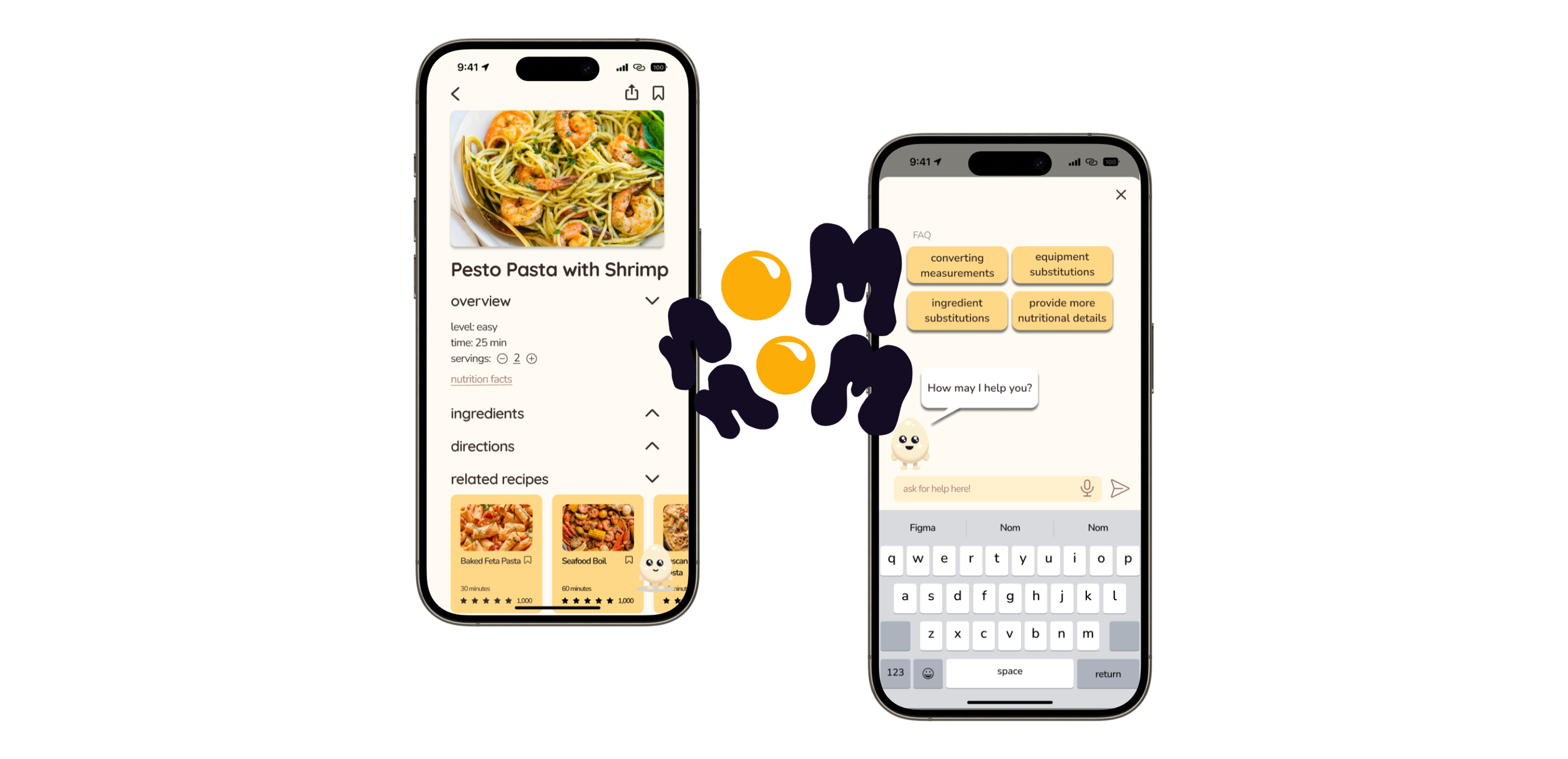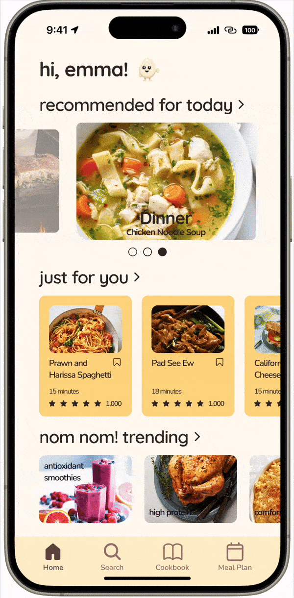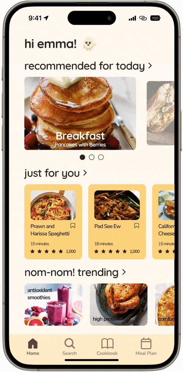 nom nom! is a recipe app designed to assist beginner cooks throughout the entire cooking process, from planning to preparation. Our goal was to create an intuitive interface that seamlessly integrates personalized guidance and real-time support powered by AI, empowering users to become comfortable in the kitchen. This study explores this issue and our solutions through a holistic UX process, from research to iterative designs and testing. nom nom! turned cooking into a stress-free journey for beginners, providing a comprehensive, intuitive, and engaging experience for users looking to learn and enjoy cooking.