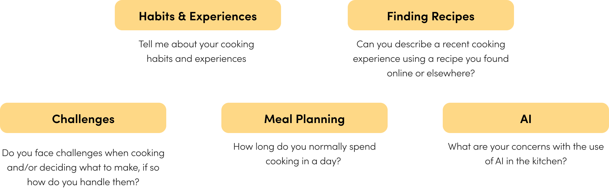 Our questions were centered around 5 main topics listed to the right along with example questions. We were able to identify key patterns and behaviors by understanding these areas of respondents’ relationships with cooking.