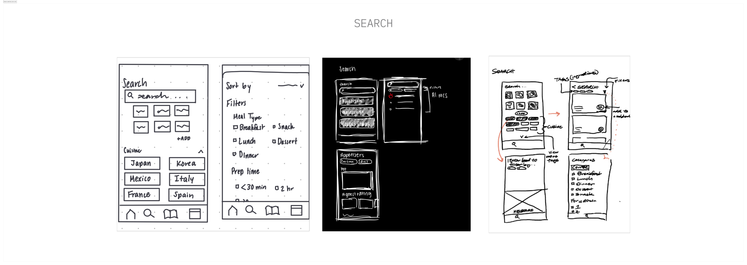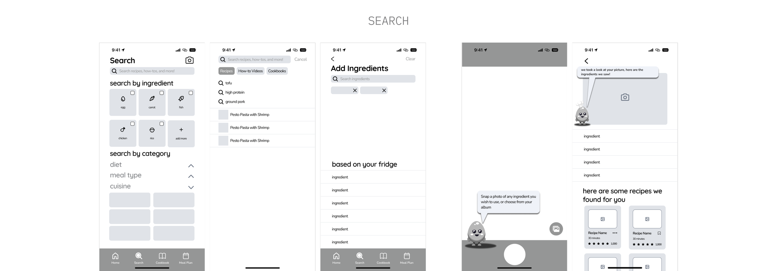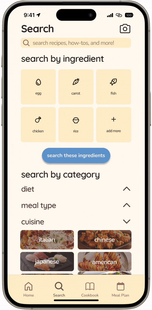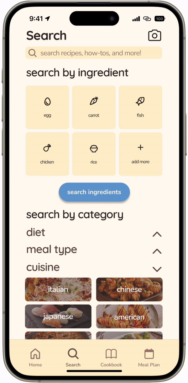 The Search page supports searching by ingredients through both manual search, customizable quick search options, and AI photo recognition.