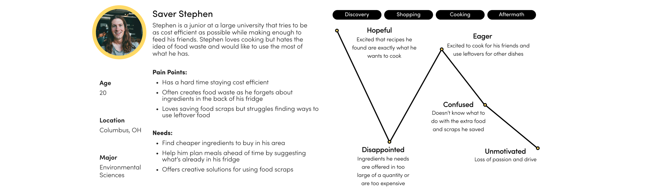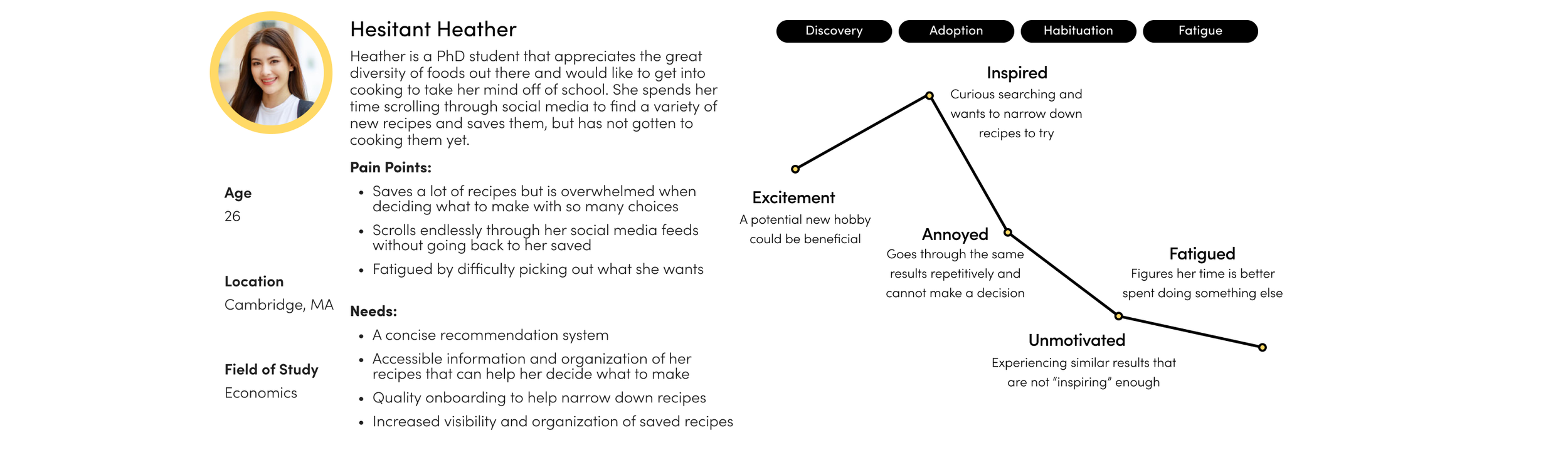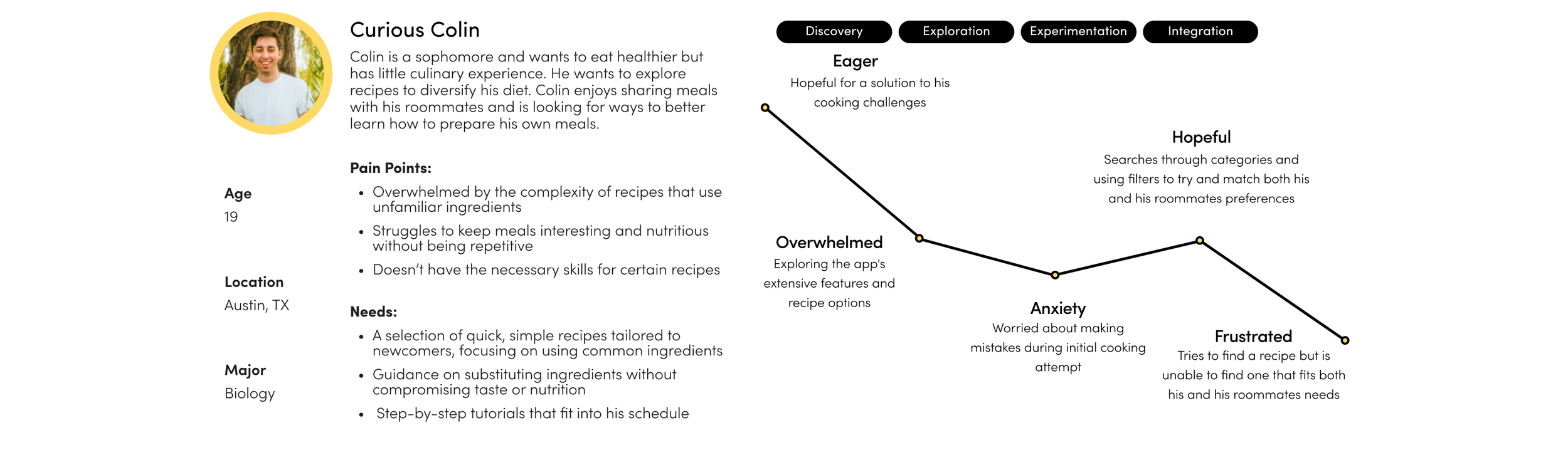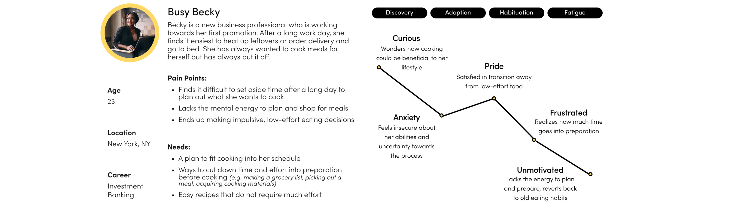 Their journeys detail the different stages of their experiences with cooking, showing their intent and what ultimately hinders their relationship with cooking. The personas and journeys helped us plan our features around users’ needs and pain points and justify our solutions. I personally created Busy Becky, a user whose struggle focuses on meal planning and preparation. As a lead, I also gave feedback to team members to develop their stories and user types.