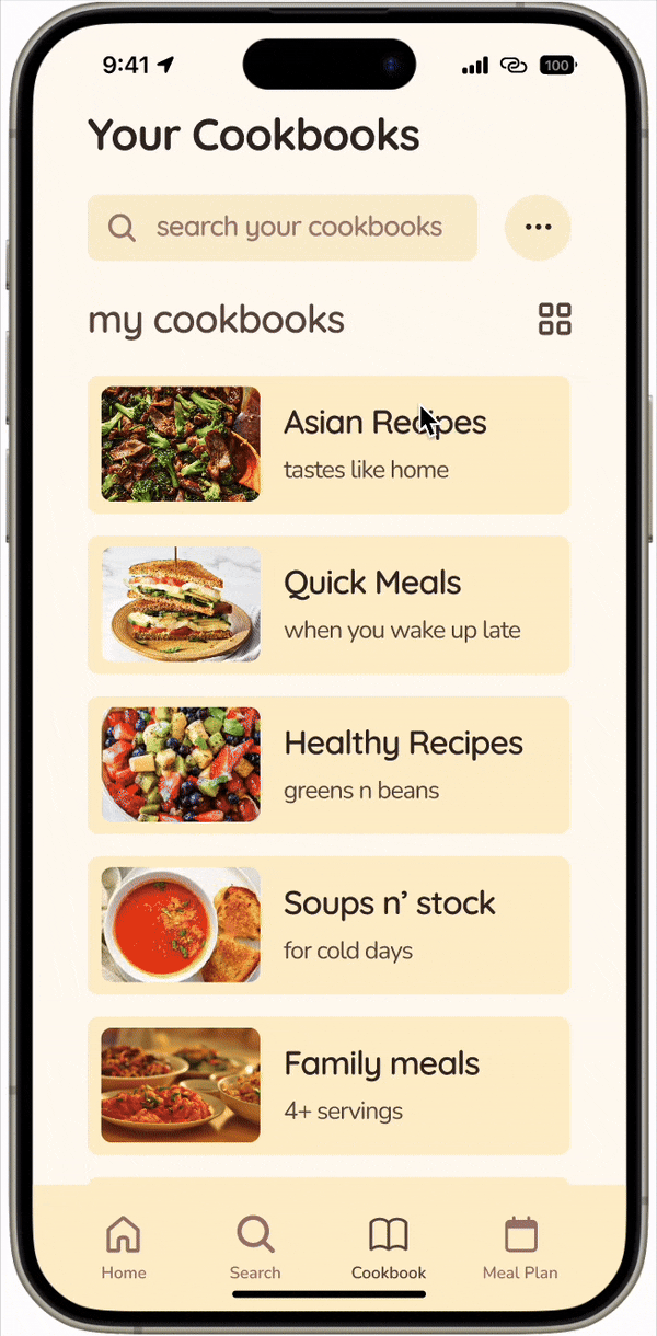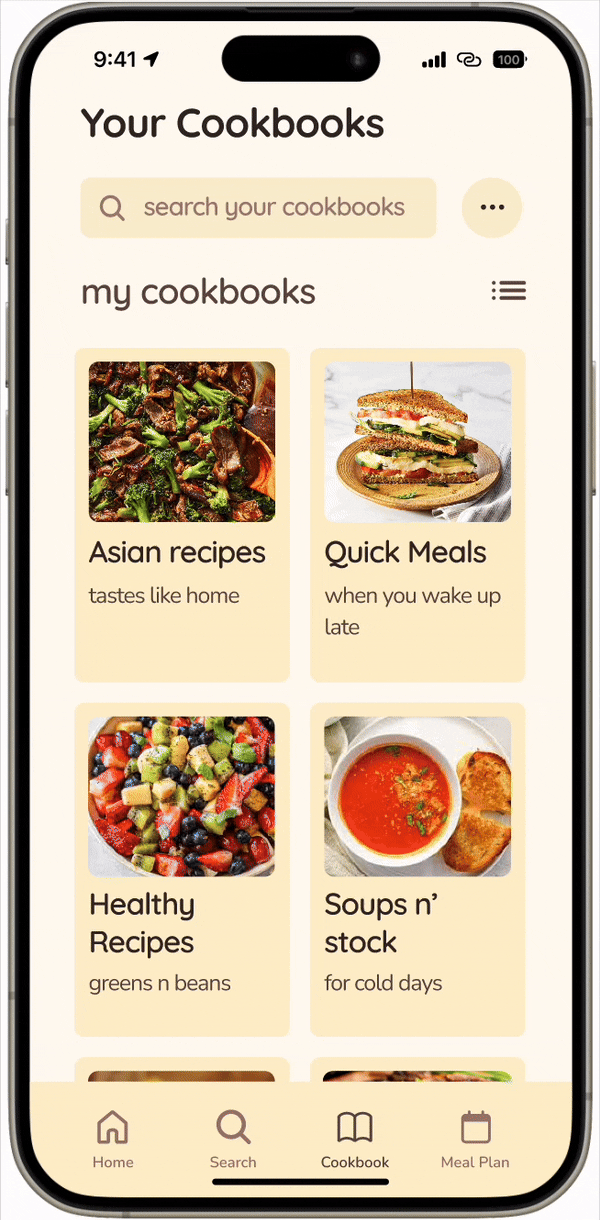 Users have the option to either pick from recipes in the app or import their own recipes to create a cookbook. They may also import entire cookbooks as well.