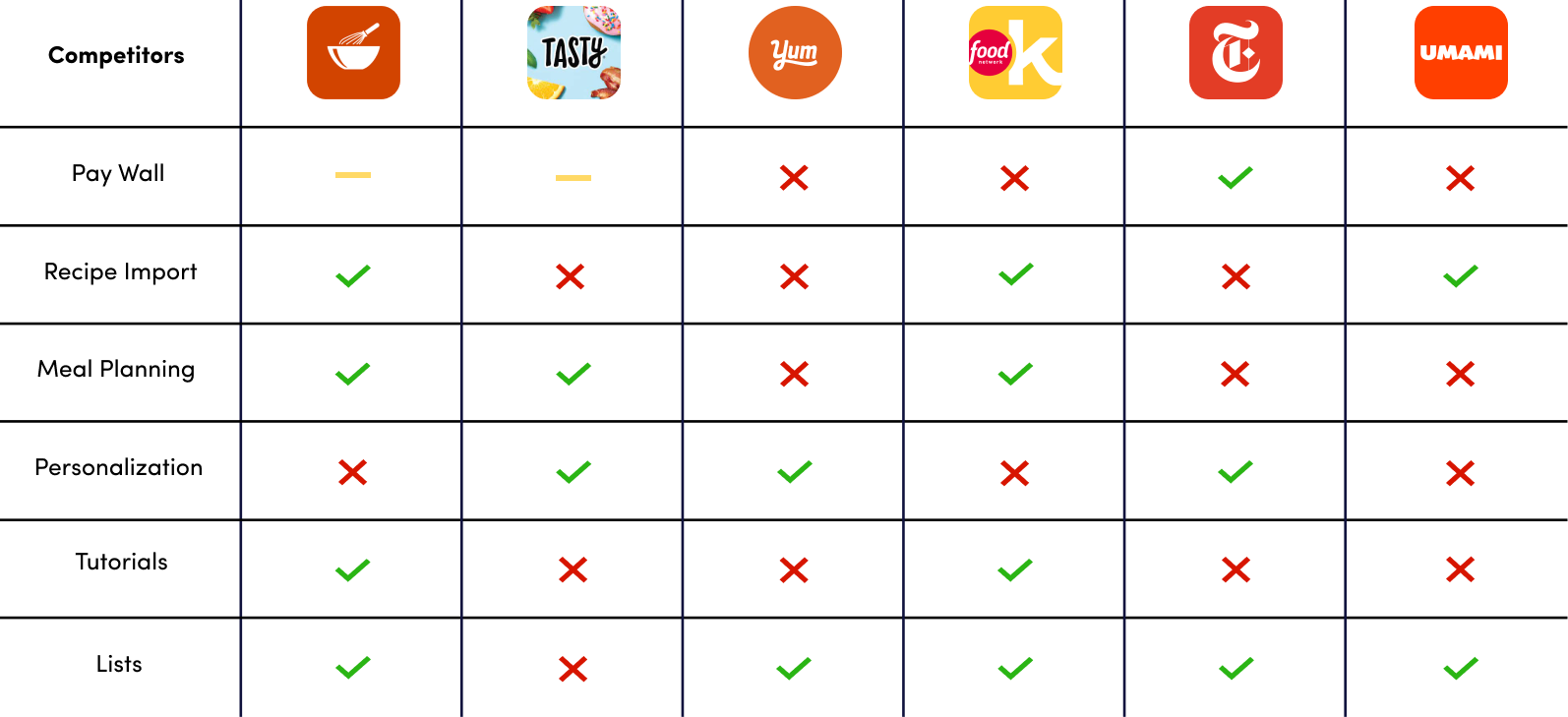 We looked into the current recipe apps available—Recipe Keeper, Tasty, Yummly, Food Network Kitchen, New York Times Cooking, and Umami. We compared our own experiences and observations on each app, identifying each app's strengths and weaknesses and what made each one unique.
