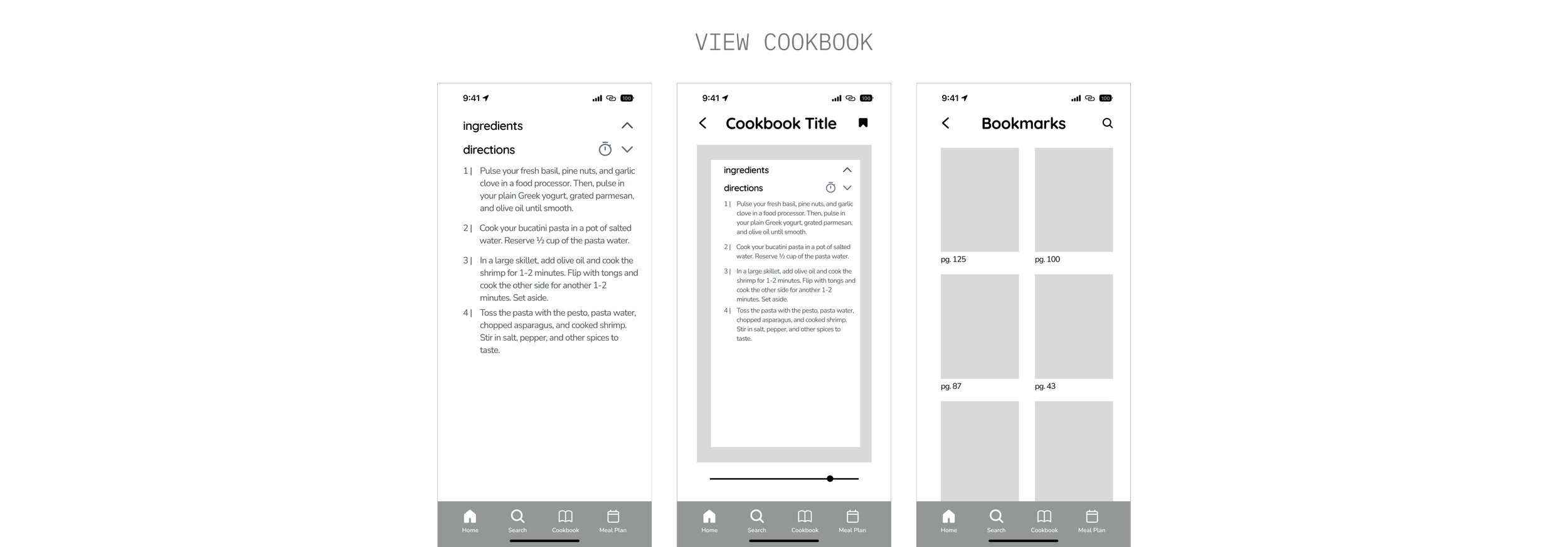 Users can flip through their cookbooks similar to an e-book. They can also zoom out to a grid view and view their bookmarked pages.