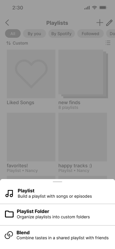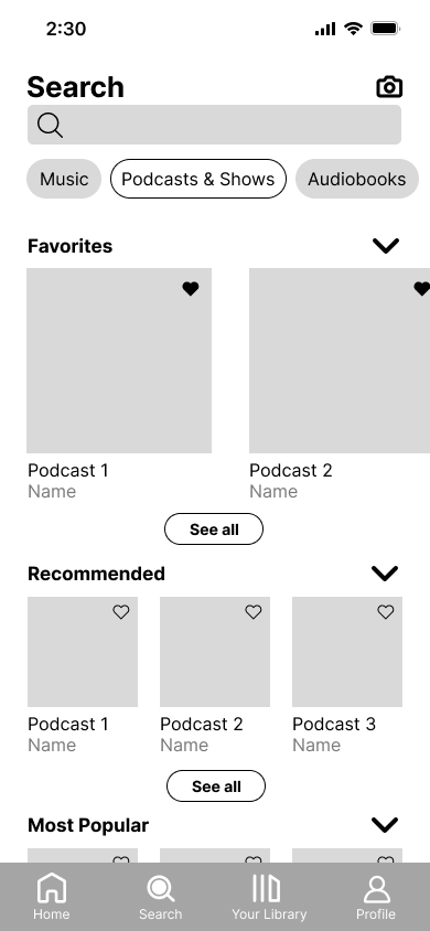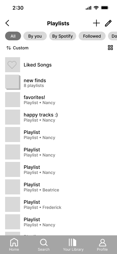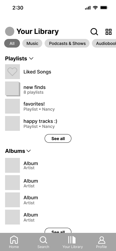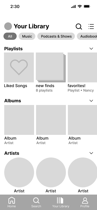 With our finished sketches, we started making our low-fidelity wireframes to properly visualize the app’s new design and figure out how our ideas would function. We designed basic screens for the new navigation tabs as well as Spotify’s onboarding.