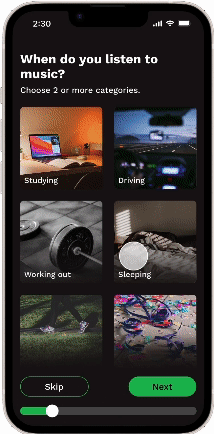 Podcasts are shown as an optional part of the onboarding. Users that listen to podcasts would go through a similar but shortened process as the music section of the onboarding for their podcast interests. Users that don’t listen to podcasts may easily skip this section entirely.