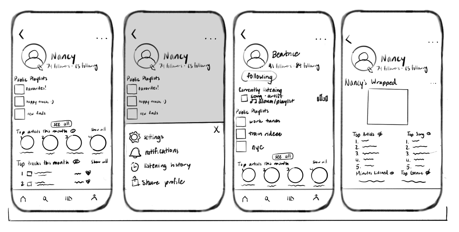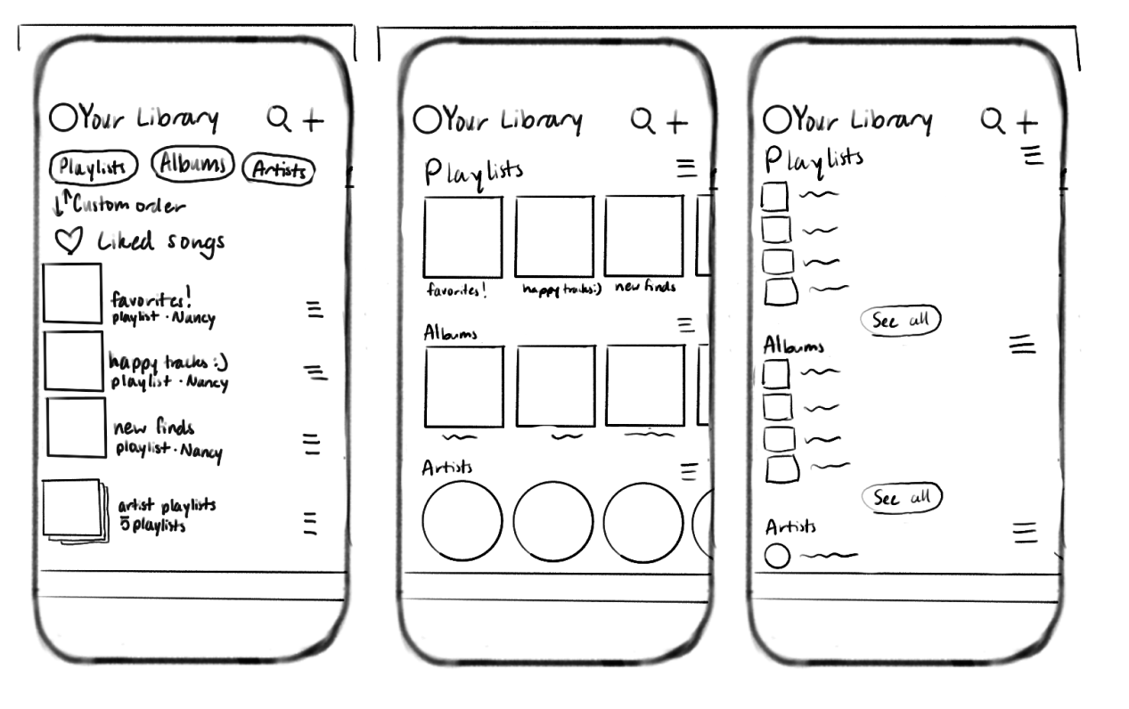 I sketched ideas for the Spotify library and profile featuring list and grid view options, sorting, expanded social features, and privacy settings to address the inconsistencies between mobile and desktop and leverage the unique social and data analysis features.