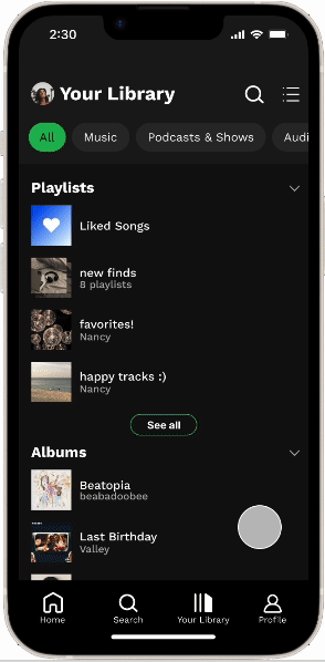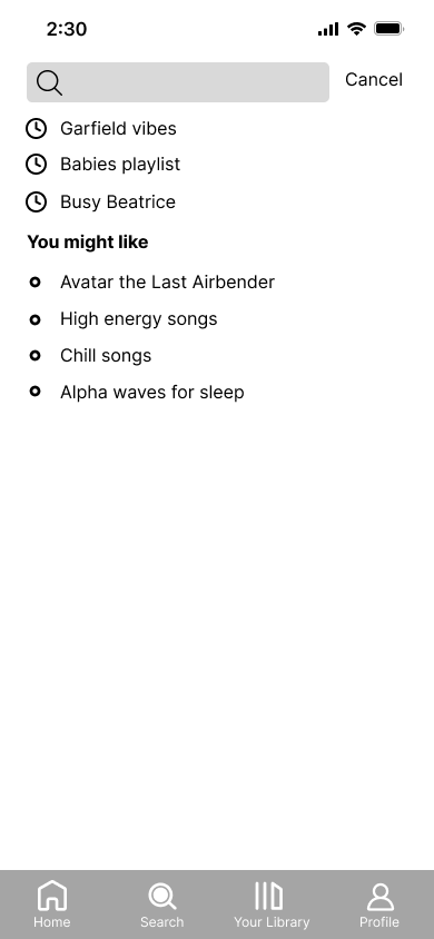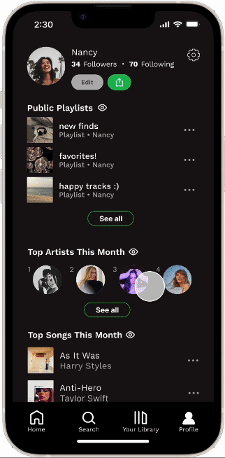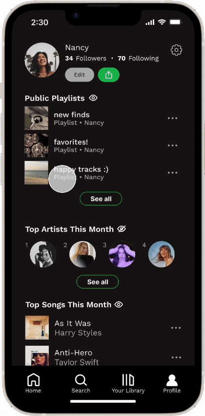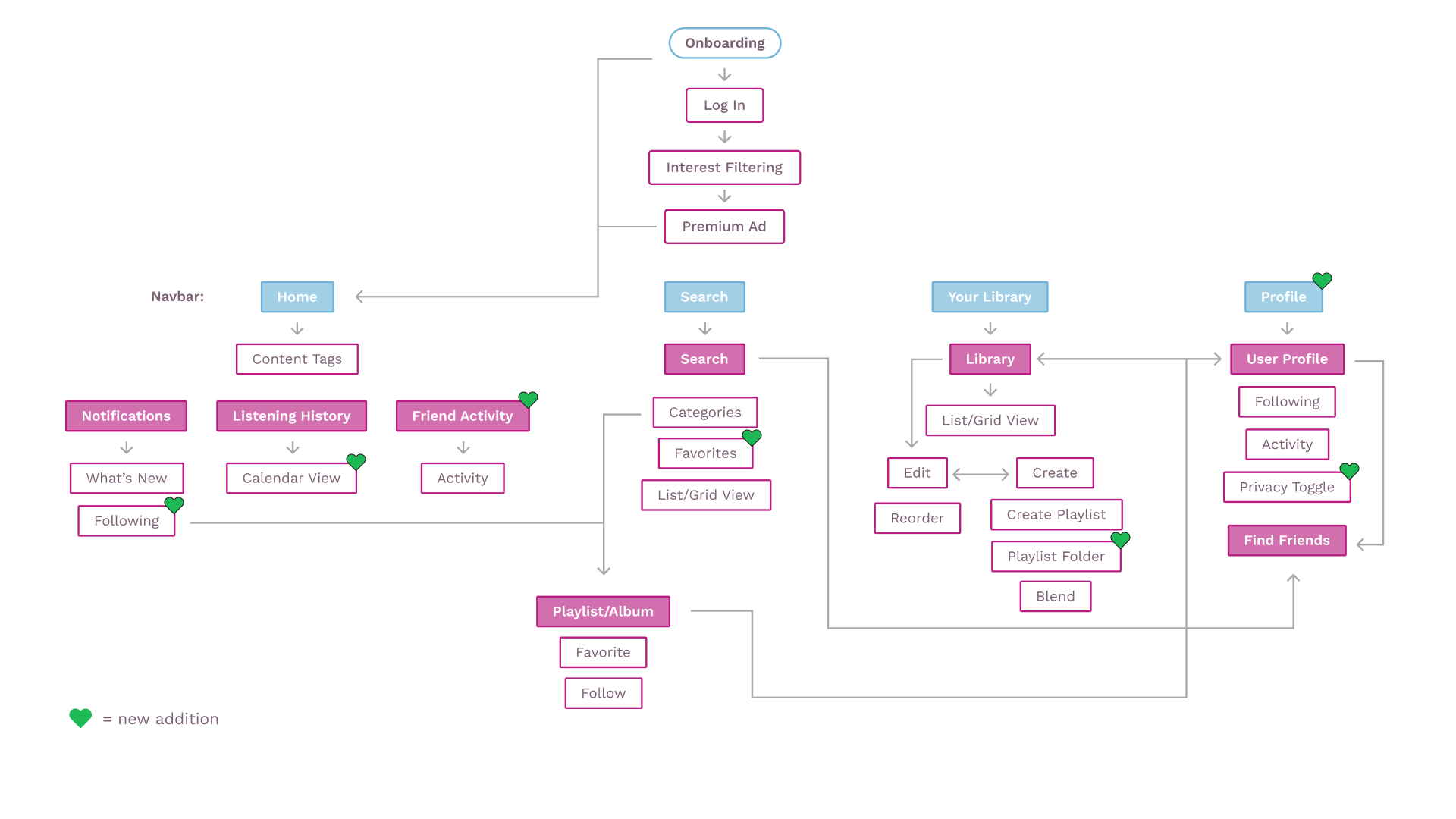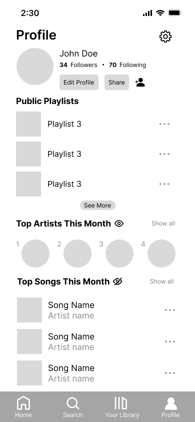 We kept the current organization of the app, but we added a new profile tab to the navigation bar to address pain points regarding difficulty accessing the profile easily as well as our insight related to the social aspect of Spotify.