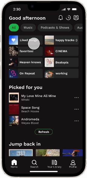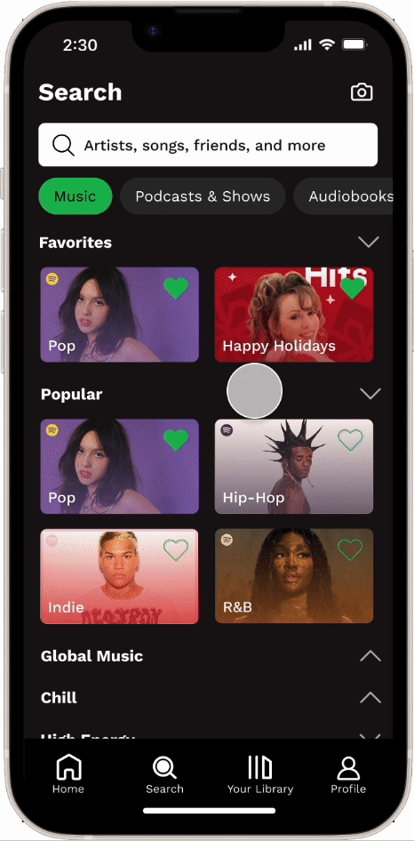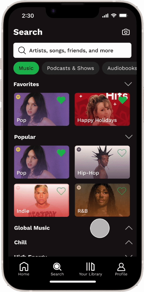 Users are able to favorite categories for easier access in the future. The categories also display a larger variety of content than just Spotify’s playlists. These allow for a more personalized experience on the Search page.