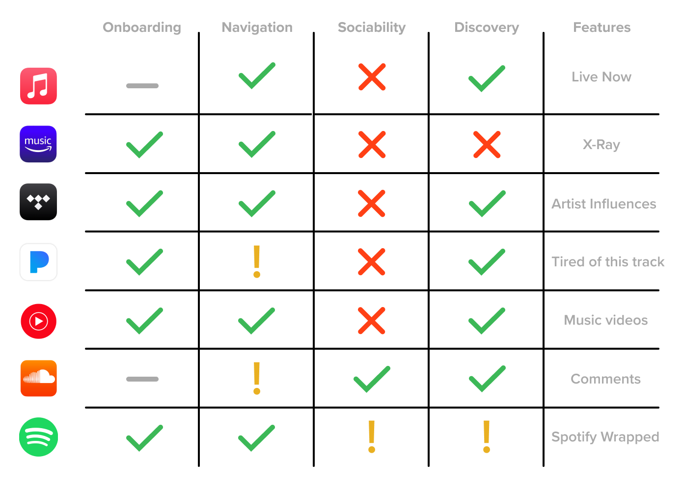 An aspect that we noticed was missing in the majority of platforms was the sociability. They mainly focus on the music streaming experience of the individual user, but music as a shared experience is not seen as a priority for most of Spotify’s competitors.